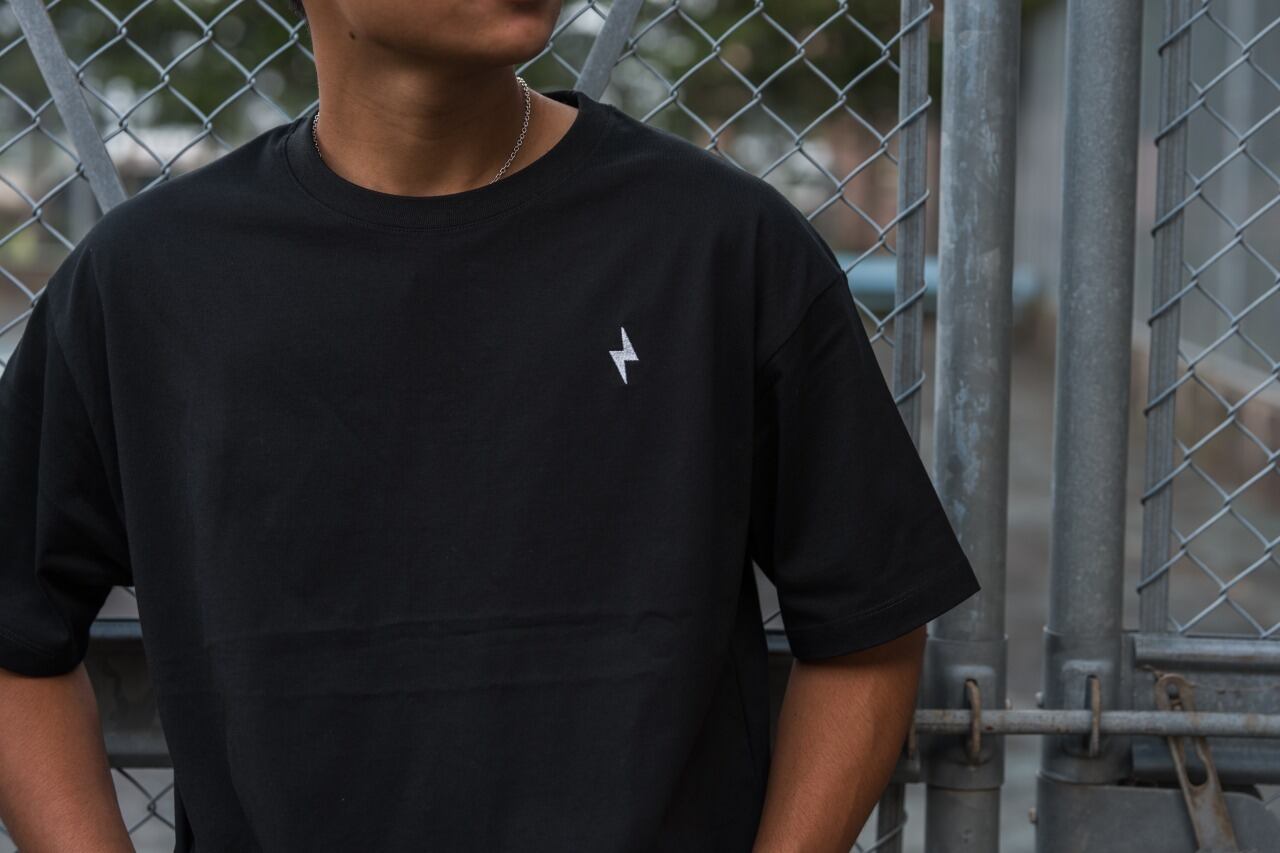 フロントは左胸元にイナヅマの⚡️マークをワンポイントで配置。バックは写実的な2本の雷の写真を大胆にプリントし、その下にオレンジで「YAPPE」を配置しました。「挑戦する人の背中を押す一枚」として、日常からイベントまで幅広く活躍できるデザインです。